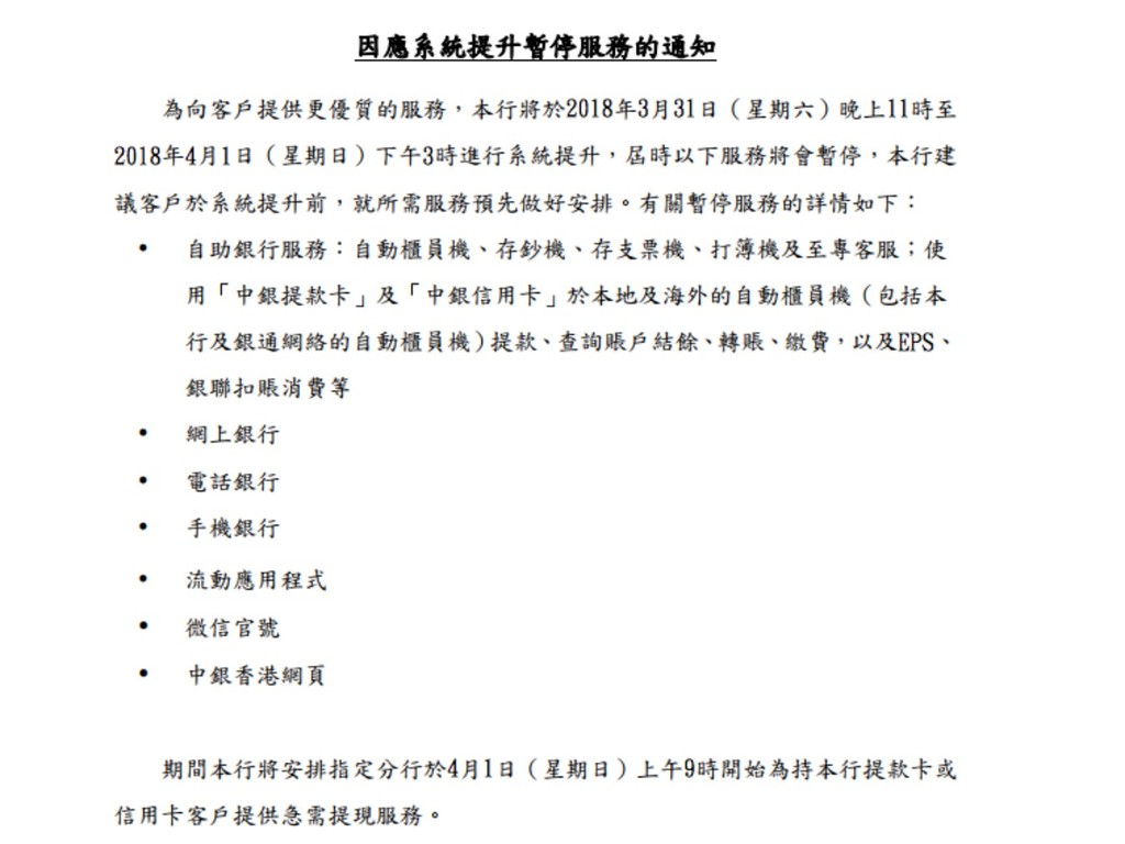 通告指,中銀香港屆時會安排指定分行於 4 月 1 日上午 9 時起,為持提款卡或信用卡客戶提供應急服務。如果大家真擔心系統更新期間,帳戶內容會受到影響的話,不妨當日到指定分行進行查詢處理。