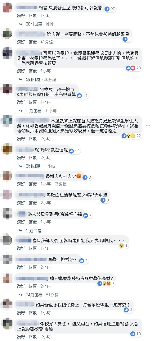 網民們見狀亦甚為嬲惱,更呼籲該網友報警求助,留言「報警,只要發生過,幾時都可以報警!」亦有網民直指學校要負最大的責任,直斥學校不知所謂。此外,也有網民道出自己亦曾遭欺凌,更表示學校當時只想私了,所以一係打反轉頭,打到佢哋怕;一係就跳過學校報警求助