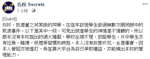 該位上載影片的網友,更留言道自己正是董之英某級的學生,並表示年間該班學生做過無數次網民眼中的欺凌事件,又表示影片的一段,可以見到被欺凌的同學的神情是不情願。因此,這並非學校說出的過火嬉戲,而是學校坐視不理,放縱學生。又表示片中的學生亦有狂燥、賭博、吸煙等習慣和病態。而該網友更表示自己沒有故意誇大言詞,全是事實。更留言指「本人曾經亦被虐打,希望靠大平台為自己爭取權益,亦能導出本校的管理能力。」