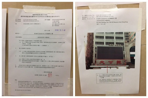 反對逃犯條例修訂引起一連串風波,曾到港島遊行的人,應該都知道灣仔軒尼詩道國華大廈外,《大公報》安裝了一個大型 LED 屏幕及其招牌。隨後有連登巴打質疑大公報招牌屬潛建,並向 1823 投訴。灣仔大坑選區區議員楊雪盈跟進後發帖,指屋宇署於 23 日作出回覆,確定大公報招牌不符圖則,屬違例建築,業主需在 30 天內展開工程拆除。